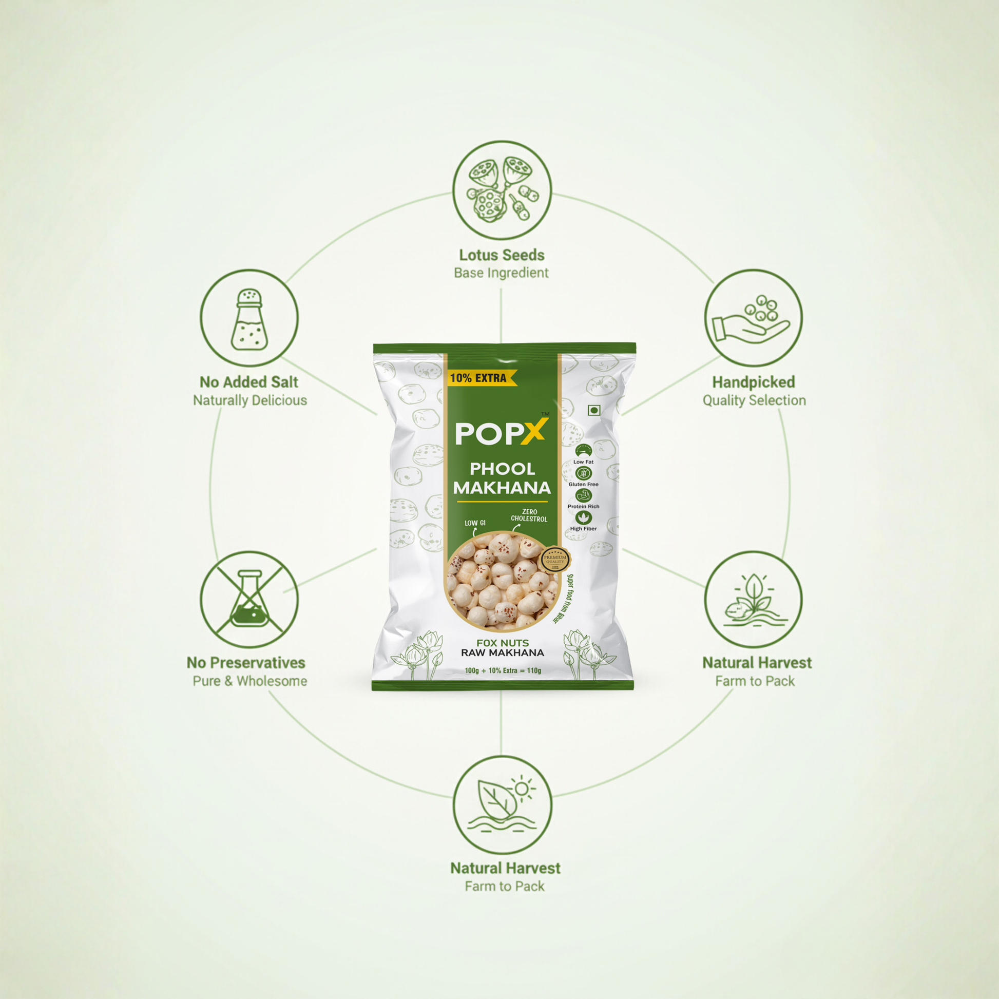 100% Phool Makhana (Lotus Seeds). No additives, no preservatives.